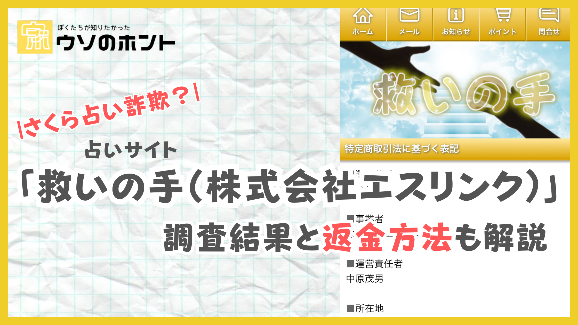 占いサイト「救いの手(株式会社エスリンク)」はさくら詐欺?調査結果と返金方法も解説 2026 1/06 占い詐欺 個別占い業者についての注意喚起/解説 2026年1月6日 占い詐欺 個別占い業者についての注意喚起/解説 よかったらシェアしてね! URLをコピーしました! URLをコピーしました! 占い詐欺は返金できる?弁護士に依頼するメリットと返金成功率を高める証拠の集め方 この記事を書いた人 うそほん編集部 うそほん編集部です。情報商材・占い・副業など、ネット上の「それっぽい話」を調査し、仕組みと注意点をわかりやすく整理しています。 関連記事 占い詐欺は返金できる?弁護士に依頼するメリットと返金成功率を高める証拠の集め方 2025年12月22日 鑑定時間を引き延ばす占いは詐欺?占い詐欺の手口と詐欺師の心理構造を解説 2025年12月21日 コメント コメントする コメントをキャンセルコメント ※ 名前 ※ メール ※ サイト 次回のコメントで使用するためブラウザーに自分の名前、メールアドレス、サイトを保存する。